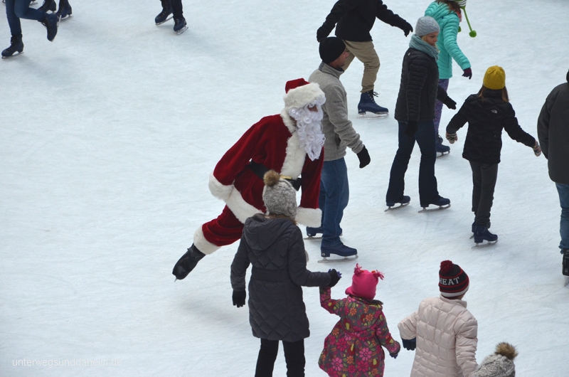 Die berühmteste Eislaufbahn ist der Rockefeller Rink vor dem Rockefeller Center, genau unter dem weltberühmten Weihnachtsbaum, auf dem zur Weihnachtszeit tausend strahlende Lichter leuchten. Genauso berühmt wie der Weihnachtsbaum ist auch die goldene Prometheus Statue am Rockefeller Rink. Und auch die Umgebung der Schlittschuhbahn glänzt im weihnachtlich schönen Licht. Hier ein paar Runden auf dem Eis zu drehen, ist schon etwas ganz Besonderes und exklusives. Romantischeres Schlittschuhlaufen gibt es wohl nirgendwo sonst auf der Welt. Allerdings sind hier natürlich auch zu jeder Tages- und Nachtzeit immer viele Menschen auf dem Eis. Die Bahn ist dementsprechend voll (aber wo nicht?) und ganz billig ist der Spaß auch nicht. Wer es ganz exklusiv mag, trifft sich zum Brunch in der Rockefeller Plaza, setzt sich mit einem Glas Champagner vor die Glasscheibe und schaut den Eisläufern bei ihrem Treiben zu oder schnallt sich im Anschluss selbst die Schlittschuhe an!