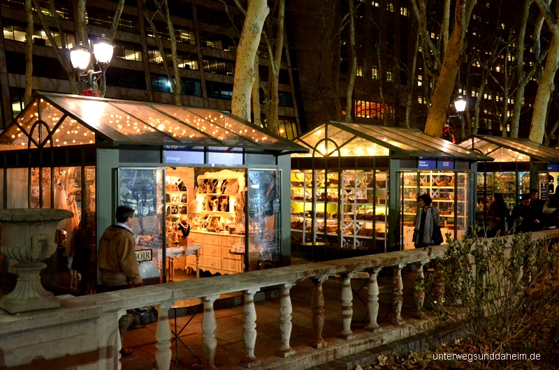 Um die Eislaufbahn im Bryant Park findet man diese Weihnachtsmarktbuden