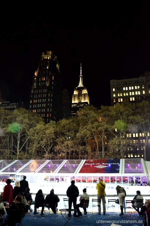 Der Bryant Park ist sehr beliebt zum Schlittschuhlaufen in New York, denn hier kann man ganz umsonst seine Bahnen auf dem Eis drehen. Daher ist diese Schlittschuhbahn auch immer sehr voll. Auch die New Yorker kommen hier gerne zum Ice Skating her und wenn es nur kurz in der Mittagspause ist. Am Abend treffen sie sich für romantische Winterdates und erste Annäherungsversuche auf dem Eis (ganz witzig zu beobachten). Besonders nett am Bryant Park sind die kleinen Buden, die um die Schlittschuhbahn herum aufgestellt sind. Sie ähneln kleinen Hütten, wie wir sie von unseren deutschen Weihnachtsmärkten her kennen und genau dafür sind sie im Winter auch gedacht. Wer vom Schlittschuhlaufen genug hat, kann hier gemütlich durch die Hütten wandern und Schmuck, Kerzen, etc. einkaufen, eben genau das was wir auch auf unseren Weihnachtsmärkten finden. Waffeln und Crepés gibt es hier natürlich auch.