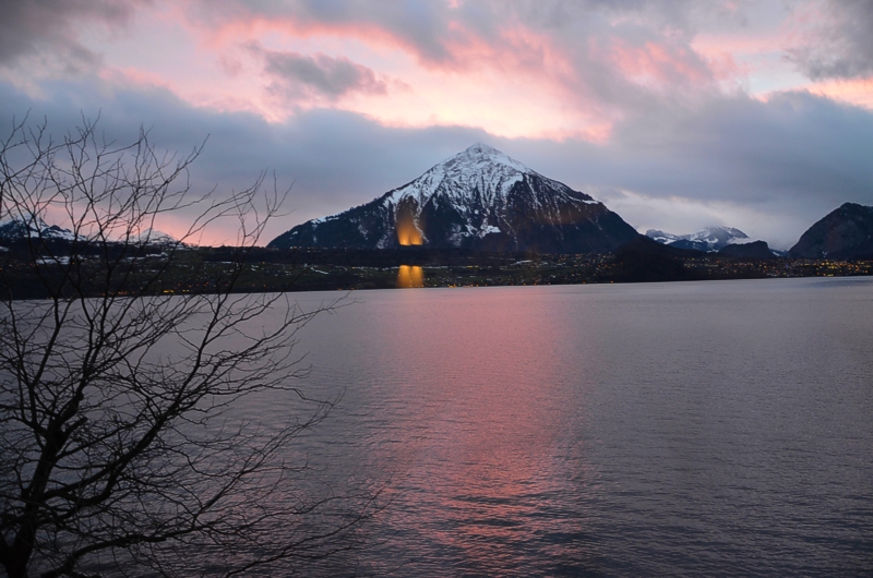 Ein Fischer wirft seine Netze aus und fährt völlig geräuschlos über den See. Der Gipfel des Niesen spiegelt sich im Wasser. Es ist völlig ruhig. Ich trinke den letzten Schluck meines Cappuccinos und spaziere durch den morgendlichen Garten. Die Kellner richten die Polster für die Sitzmöbel im Garten her, es sieht aus als würde es schön werden heute. Hier am Thunersee herrscht ein mediterranes Klima, an meinem Januarwochende erlebe ich frühlingshafte Temperaturen. Man sitzt hier unter Palmen, blickt auf den Thunersee und den Hausberg Niessen, gleich gegenüber des Wellness & Spa Hotels Beatus in Merligen, im Berner Oberland. Dabei sind die Gipfel der schneebedeckten 4.000er gar nicht weit entfernt. Eiger, Mönch und Jungfrau bilden das berühmteste Dreigestirn am Panorama um den Thunersee.