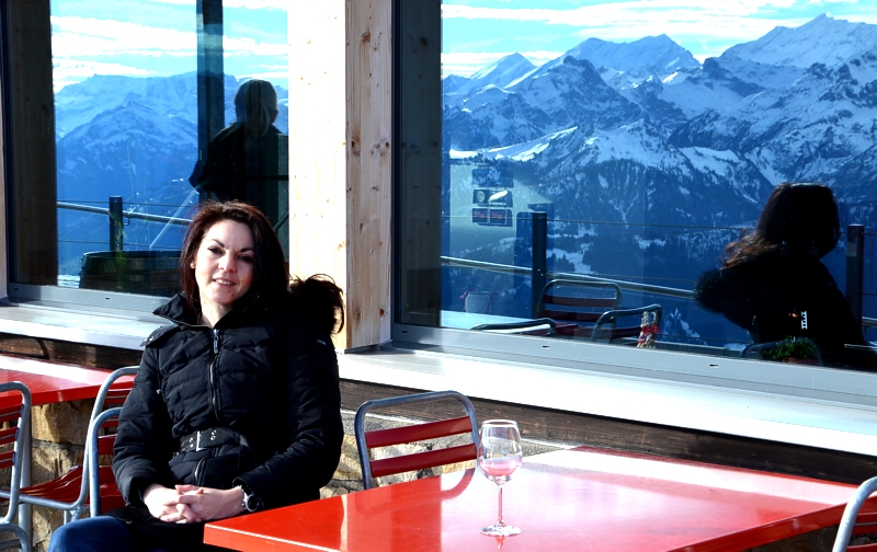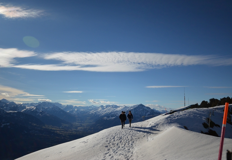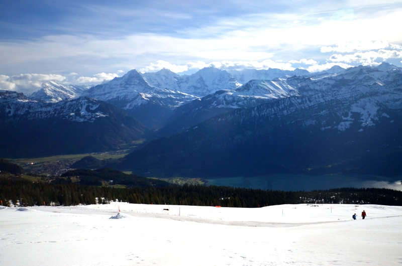 Ich habe mich so sehr auf winterliches Bergpanorma gefreut und mir schon im Vorfeld Wandertouren ausgesucht. Und dann komme ich in die Schweiz an den Thunersee und sitze auf der Terrasse unter Palmen bei frühlingshaften 14 Grad. Meine Rettung ist Volker, er unternimmt mit den Gästen des Beatus Wandertouren in die Umgebung oder fährt sie mit dem hauseigenen Boot über den Thunersee. Ich brauche mir als Hotelgast also gar nicht selber den Kopf zerbrechen, wo ich die schönsten Routen zum Wandern finde. „Volker“, sage ich, „ich will die Berge sehen“. „Kein Problem,“ sagt er, „dann fahren wir aufs Niederhorn“. Mit der Bergbahn fahren wir von der Beatenbucht aus auf den Beatenberg hinauf. Von dem frühlingshaften Thunersee geht es durch die grünen Wälder und bis zur Bergstation auf dem Gipfel auf 1.950 Meter Höhe. Hier steigen wir aus und watscheln durch den Schnee. Der Wind heroben ist eisiger als im Tal. Um mich herum genau das fantastische Bergpanorama, das ich mir so sehnlichst gewünscht habe. Es ist einfach unbeschreiblich hier oben zu stehen, auf die schneebedeckten Gipfel der Berge zu schauen, über mir blauer Himmel und unten im Tal liegt in aller Ruhe der Thunersee. Auch die beiden Städte Thun und Interlaken kann ich am anderen Ende des Thunersees sehen.