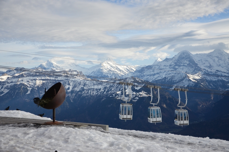 Wir wandern durch den Schnee, sinken ab und zu kniehoch ein. Volker zeigt mir, wo im Sommer Steinböcke hin und her springen. Ich habe noch nie einen in der freien Wildbahn gesehen. Vom Niederhorn aus hat man das beste Panorama auf die berühmten Berge: Eiger, Mönch und Jungfrau mit Jungfraujoch. Die Eiger-Nordwand ist unter Bergsteigern weltberühmt, die Jungfrau gehört seit 2001 sogar zum UNESCO Weltnaturerbe. Der Eiger liegt auf 3.970 Metern, die Jungfrau auf 4.192 Metern und der Mönch auf 4.107 Metern. Ich kann mich an dem Panorama kaum sattsehen. Winterliches Bergpanorama ist einfach wahnsinnig schön. Hier oben kann man auch sehr gut Schneeschuhwandern oder Schlitteln. Wir beobachten eine Schlittelgruppe, die immer wieder mit dem Schlitten umfallen. Volker sagt, und für das alles hier bekomme er auch noch Geld. Das scheint sein größter Luxus zu sein. Und ich denke, ja, man, du Glückspilz. Es gibt schlechtere Arbeitsplätze als diesen hier.