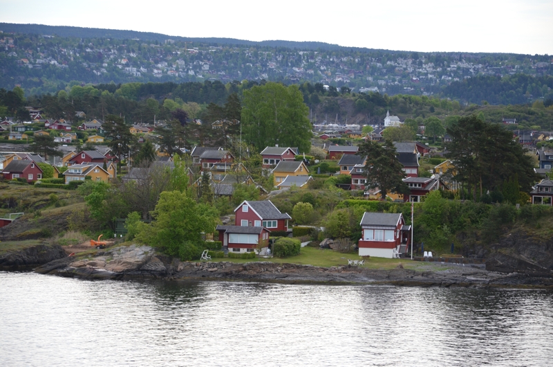 Wie schon erwähnt empfehle ich die Ankunft in Oslo per Schiff durch den Oslofjord. Denn die Fjordlandschaft ist wunderschön und gibt einem schon mal einen guten Einblick in das was einen in Norwegen erwartet. Links und rechts vom Oslofjord entdeckt man immer wieder kleine rote Holzhütten einsam auf einem Felsen, ja, sogar eine Kirche habe ich mitten auf einem Felsen stehen sehen. Der Oslofjord ist übrigens der einzige Fjord in Norwegen, der im Winter auch mal zufrieren kann, weil er zuweit vom Golfstrom entfernt ist.