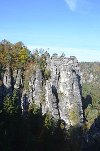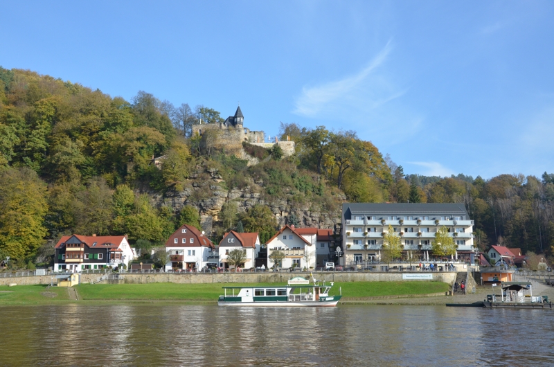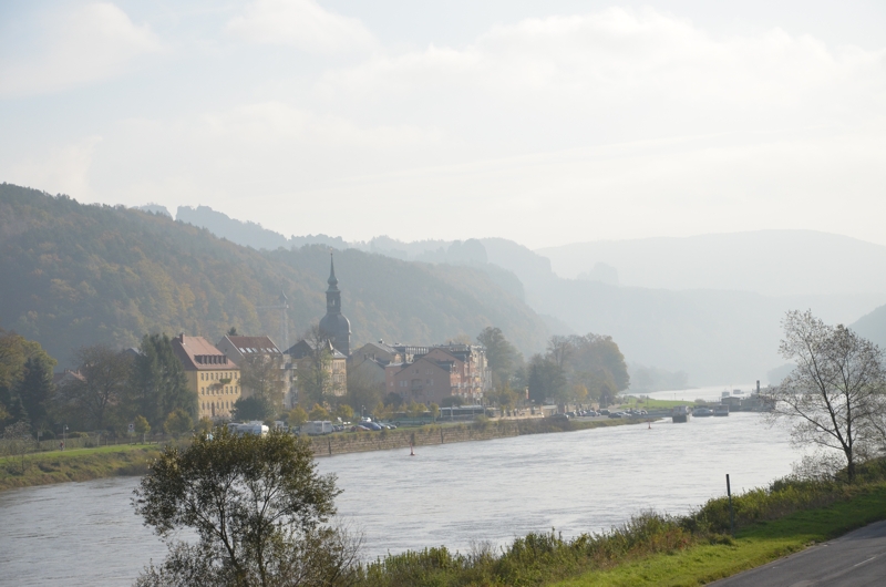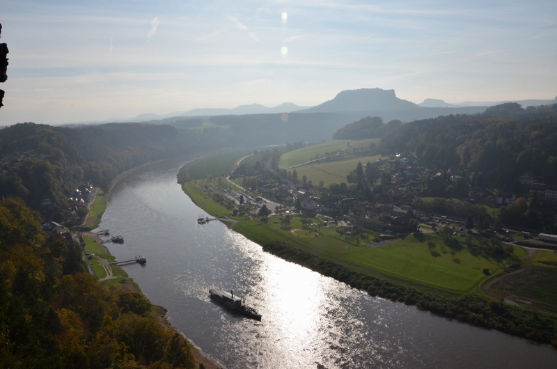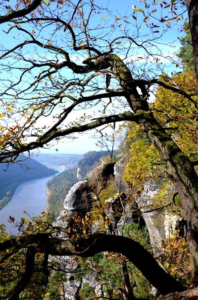 In Rathen, dem malerischen Dorf an der Elbe, steige ich aus und von hier geht es direkt zu Fuß mitten hinein ins Wandergebiet. Hinter dem Dorf führt ein Waldweg hinauf zu den „wildromantischen Felsformationen“, wie die seltsamen Felstürmchen seit der Romantik bezeichnet werden. Die goldene Oktobersonne schien durch das Herbstlaub, malte die Landschaft in ein warmes Licht. Immer wieder bleibe ich stehen, schaue hinunter und in die Weite über das Elbetal. Unten fließt die Elbe gemächlich dahin.