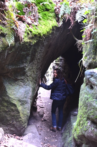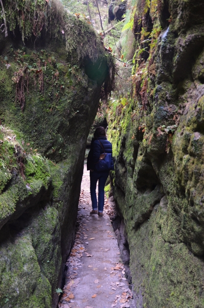Wir verlassen den magischen Ort über die 700 Stufen, die uns hinunter zu den „Schwedenlöchern“ führen. Hinter den Schwedenlöchern verbergen sich mit grünem Moos bewachsene Steinklumpen und keine Löcher. Im 30-jährigen Krieg sollen die Bauern hier ihr Habe vor den schwedischen Truppen versteckt haben, daher der Name der Gesteinsschlucht. Die Schlucht ist ein einziger Abenteuerspielplatz. Sie führt hinunter zum Amselsee. Leider ist Ende Oktober kein Wasser mehr im See, im Winter wird es wohl abgelassen, während man im Sommer hier auch Boot fahren kann. Trotzdem ist es wunderschön hier entlang zu laufen, während die Sonne durch die Baumwipfel scheint und Fischernetze wie aus dem letzten Jahrhundert in der Sonne trocknen.Hier beinahe am Ende des Weges erwartet uns ein kleines nettes Wanderlokal. Hungrig und durstig kehren wir ein, finden uns in Gesellschaft von zahlreichen Wanderern, zugegeben meist älteren Semesters. Gibt es eigentlich in meiner Altersgruppe auch Menschen, die gerne Highheels in der Stadt tragen und am Wochenende mit Wanderschuhen durch die Wälder streifen? Jedenfalls schmeckt das Essen nach dieser Tour um so mehr. Hier verabschiede ich mich vom Elbsandsteingebirge, fahre zurück nach Dresden und von dort nach Frankfurt. Aber vielleicht schaffe ich es ja wiedereinmal in diesen Teil Deutschlands, gerne auch bevor ich das durchschnittliche Wanderalter erreicht habe. Denn die Natur, ist ja für jeden da.