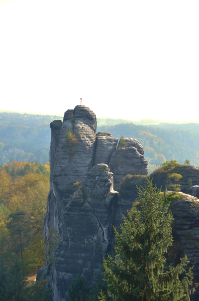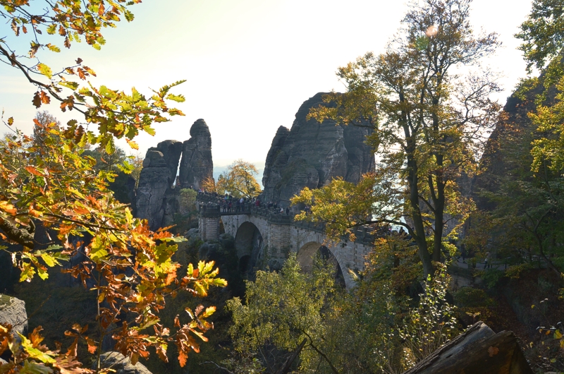 Der Wanderweg Malerweg führt direkt zum größten Besuchermagneten des Elbsandsteingebirges, direkt zur wichtigsten Attraktion der Region: der weltberühmten Bastei. Hier an der Bastei, vereinigen sich die Felstürme wie zu einem Meeting. Über Hängebrücken schreiten Besucher von Felsturm zu Felsturm und immer findet man eine bessere Aussicht, die einem den Atem nimmt. Diese Aussicht über die Landschaft des Elbsandsteingebirges lässt einen vergessen, woher man kommt und wohin man will. Sie lässt einen alles vergessen, was man bisher gesehen hat. Und das alles ist mitten in unserem Deutschland. Nicht in Neuseeland, nicht im Bryce Canyon, sondern in Sachsen. Hier liegt es vor mir, unter meinen Füßen, vor meinen Augen: das Deutschlandbild, das romantische Deutschland. Das Deutschland, das Caspar David Friedrich gemalt hat und das alle Welt verzauberte: Künstler, Musiker, Touristen. Gerade im Oktoberlicht, wenn sich das Laub der Bäume golden färbt und die Sonne tief am Himmel steht und sich langsam über die Felsen schiebt, ist es hier atemberaubend schön. Eine nahezu magische Stimmung, die mich sofort wieder in diese lebensbejahende Stimmung versetzt. Tausend Ideen schießen mir wieder durch den Kopf. Das passiert, wenn man durch die Natur läuft. Man findet zu sich, ergründet sein Inneres, so wie es einst schon die Romantiker getan haben. Inspiration in der Natur finden, es funktioniert auch heute noch.
