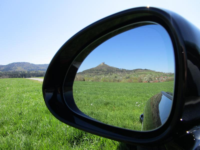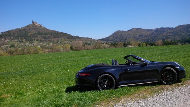 Sonne, blauer Himmel und ein Porsche Cabrio – so mancher Mann blickt uns da neidvoll hinterher. Wir fahren heute mit dem heißen Porsche-Flitzer entlang auf der Baden-Württembergischen Schlösserroute in Richtung Burg Hohenzollern und am Ende der Tour flitzen wir auf der A81 ohne Geschwindigkeitslimit zurück nach Stuttgart. Schließlich muss man den Porsche in jeder Straßenlage testen. Den Spaßfaktor dabei können wir an so einem tollen Frühlingstag im April mit offenem Dach teilweise voll auskosten.