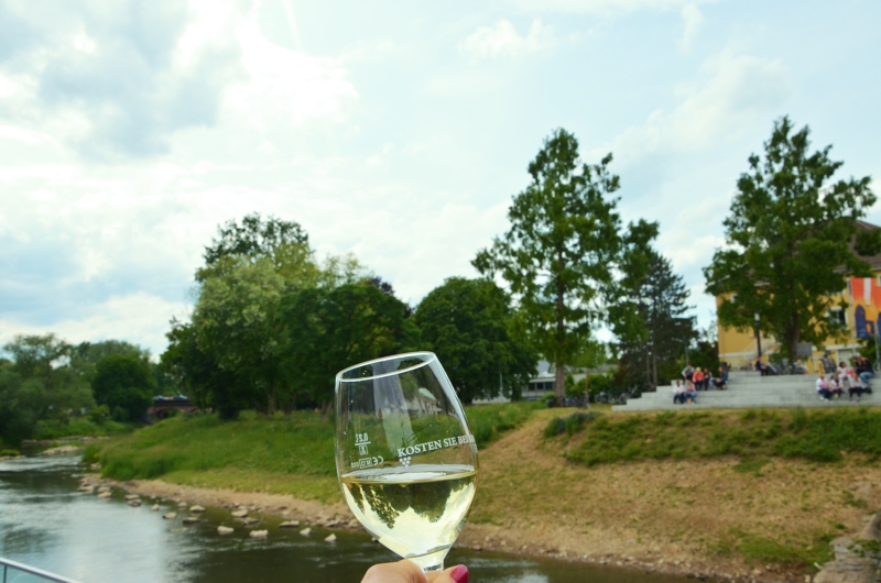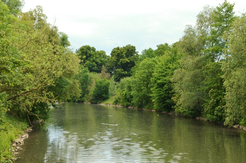 Es ist ein gemütlicher Sonntagmittag, eine gemütliche Radtour auf dem Niddaradweg hinein ins Grün und weg vom Grau der Stadt. In den Parks grillen ausländische Großfamilien, Fußgänger und Jogger versperren manchmal den Weg und auch der Niddaradweg ist an einem schönen Sonntagmittag wie diesem gutfrequentiert. In Bonames kommt man am alten Flugplatz vorbei, doch meine Fahrt geht weiter hinein in den Kurpark von Bad Vilbel. In Bad Vilbel herrscht wieder Trubel. Es ist gerade verkaufsoffener Sonntag und es scheint ein großes Straßenfest zu geben. Ich parke mein Rad und gönne mir eine Pause. Mit einem Gläschen Grauburgunder setzte ich mich ans Ufer und schaue eine Weile auf das tiefdunkle Grün der Nidda, das Hellgrün der Bäume und das Neongrün der Wiesen im Kurpark. Hinter mir japst ein Hund „er will am liebsten ins Wasser springen“, sagt seine Besitzerin und ich kanns ihm nicht verübeln.