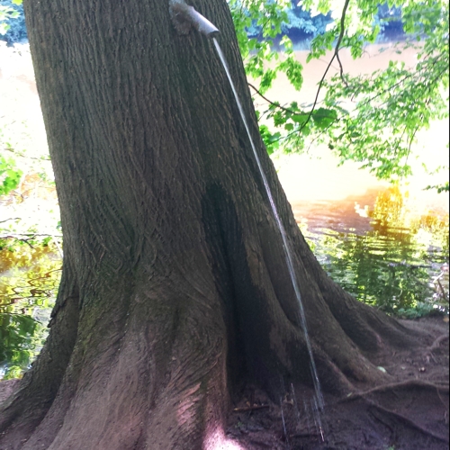 Der „Pinkelbaum“ im Stadtwald. An einem Schild steht: „seit 200 Jahren werde ich angepisst, jetzt pinkle ich zurück“. Humor haben die Frankfurter also auch