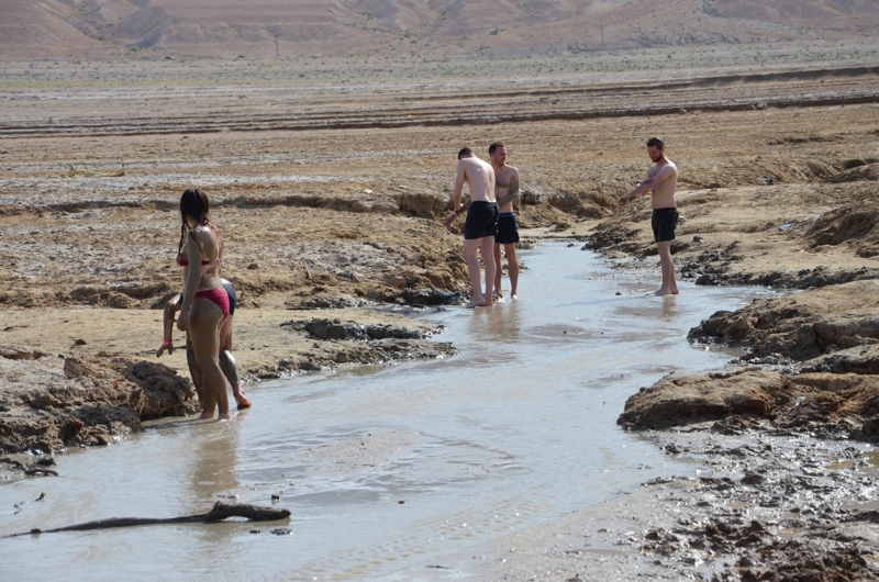 Ich nehme meine Chance deswegen gleich war und laufe zum Schlammloch. Andere Touristen haben hier schon die Schlammquelle gefunden und reiben sich mit dem Heilschlamm aus dem Toten Meer ein. Riecht ein bisschen stark wie Bitumen und Teer, aber das ist gerade dass, was meiner Haut gut tun wird. Aber nicht nur für Menschen mit Hautkrankheiten ist ein Bad im Toten Meer heilsam. Wegen seiner wärmespeichernden Wirkung ist der Schlamm auch gut für rheumatische Erkrankungen und er regt den Blutkreislauf an. Und wie Yair schon sagte, es ist vor allem die Luft, die die Leute glücklich und entspannt macht.