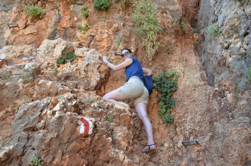 Vom Parkplatz aus gehen wir einen weiteren Weg zu den Höhlenfestungen. Dieser Klettersteig ist nur für sehr sportliche Wanderer zu empfehlen, da es steile Kletterstiege auf und ab geht und man absolut trittsicher sein sollte bzw. klettererfahren. Trotz aller Empfehlungen, habe ich mich mal wieder für meine Jesuslatschen, die Korksandalen, entschieden. Jesus hatte auch kein besseres Schuhwerk, dachte ich mir. Und damit gehe ich den Kletterstieg auch bis zum Ende. Da kenne ich gar nix. Sehr zur Verwunderung meiner Mitstreiter, die mich bewundernd anschauen, sie hätten nicht geglaubt, dass ich das durchziehe. Da kennen sie mich aber schlecht. Ich bin Steinbock und der Fels ist mein Revier. Und so steige ich mit meinen Korksandalen, meiner Handtasche und der Nikon um den Hals den Felsen hinunter, hangle mich am Seil entlang an der Wand, nur um die Höhlen der Hasmonäer zu sehen und auch, weil mich mein Entdeckerdrang gepackt hat.