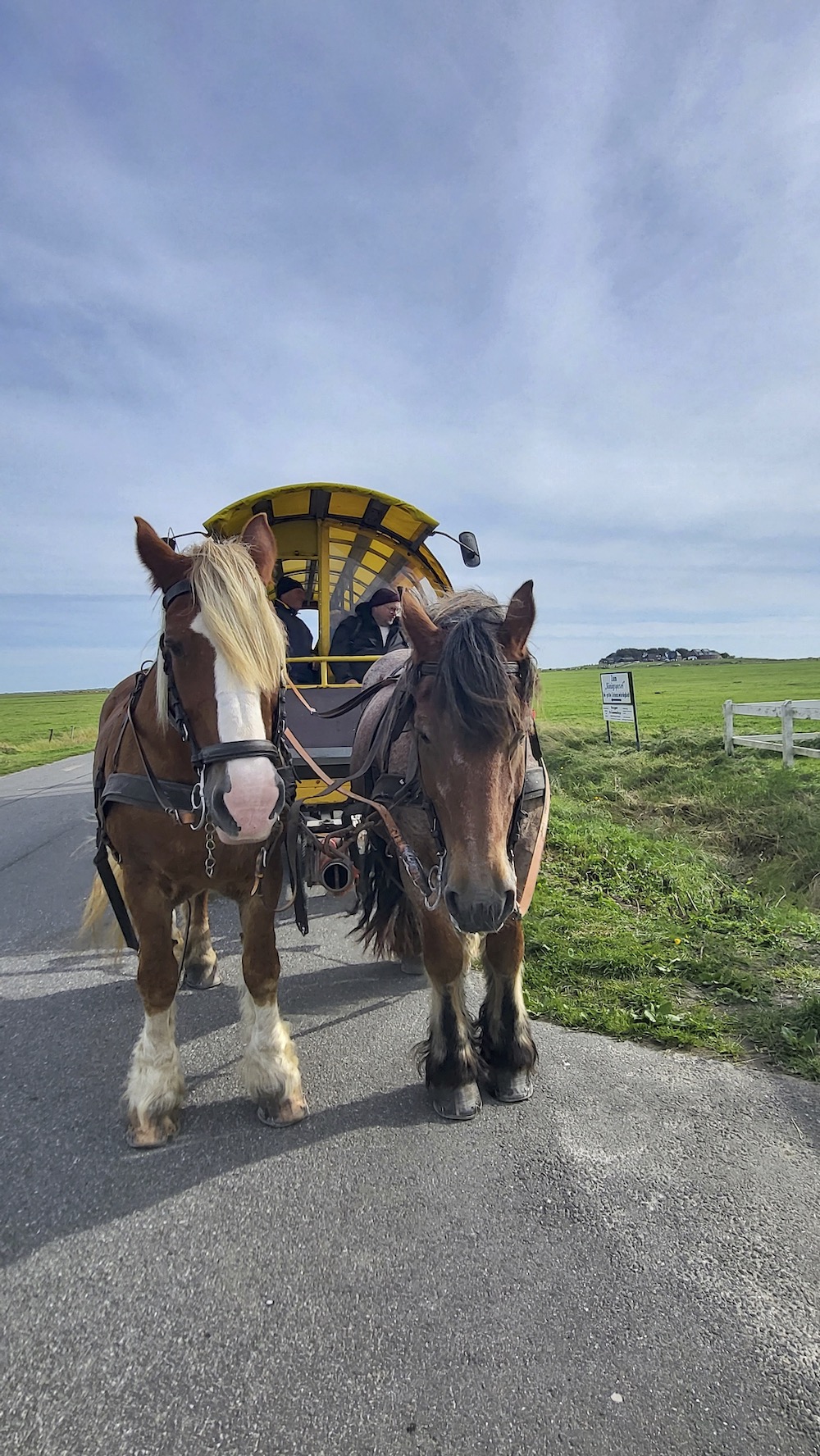 Der Seegang ist heute etwas „wackelig“ meint der Kapitän, der Adler Express Fähre, mit der ich aus Sylt auf die Hallig Hooge anreise. Nach ca. 1 1/2 Stunden Fahrt ist „Land in Sicht“. Ein paar Häusschen scheinen tatsächlich auf der Nordsee zu stehen. Am Hafen der Hallig Hooge steht schon ein Kutscher mit zwei langzotteligen Pferden für die Ausflugsgäste vom Festland bereit. Er zeigt den ankommenden Fremden die Highlights der Hallig, seiner Heimat. Natürlich könnte man auch zu Fuß gehen, doch die Hallig erscheint mir plötzlich doch größer als erwartet. Man könnte sich auch ein Fahrrad anmieten. Aber ich finde so eine Kutschfahrt ist doch irgendwie eine authentische Art und Weise die Hallig Hooge zu erkunden. Außerdem haben wir nicht soviel Zeit bis die Fähre wieder zurück fährt und schon steige ich in die Kutsche. „Willkommen im Hallig Hooge Shuttle Service“, begrüßt uns der Kutscher. Im gemütlichen Schritttempo zuckeln wir von dannen. Um mich herum weite grüne Wiesen, auf denen Kühe und Schafe grasen. Das salzhaltige Gras scheint ihnen gut zu schmecken.