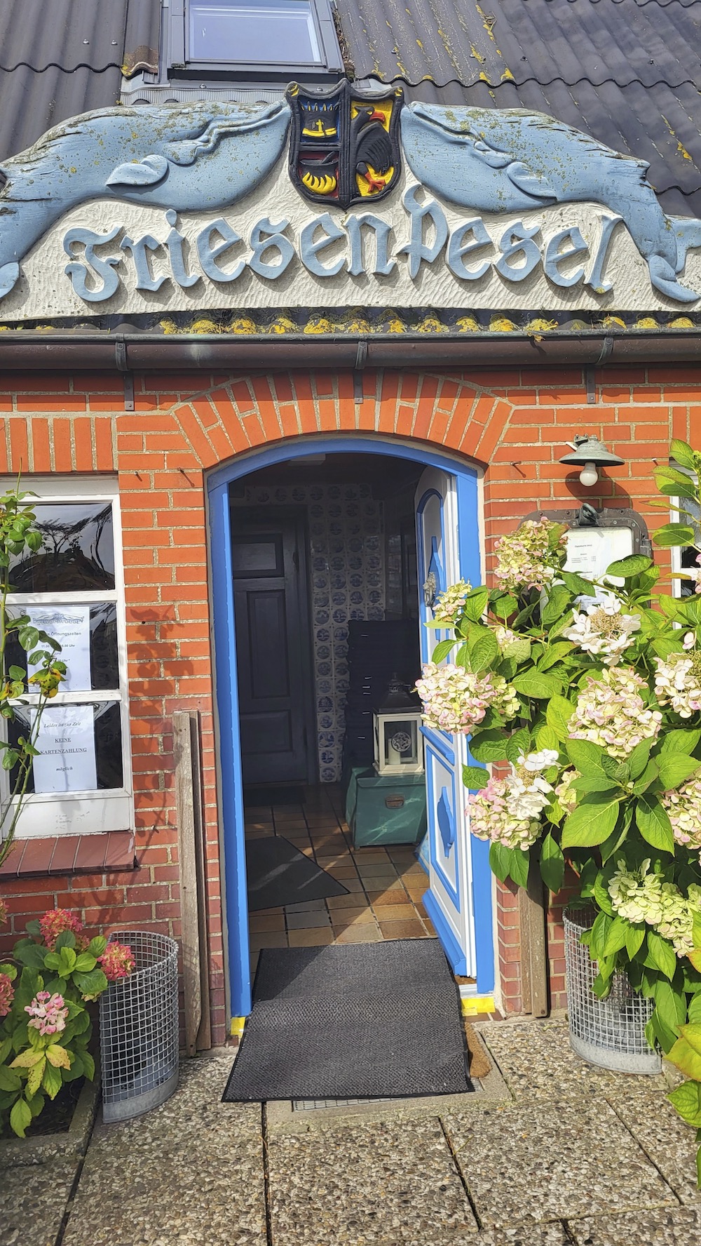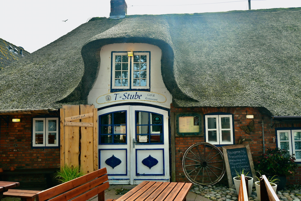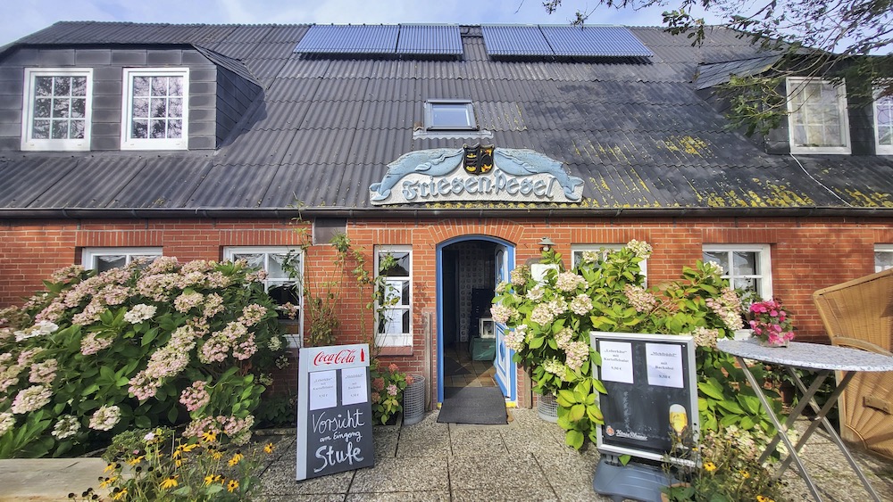 Bevor uns die Adler Express Fähre wieder nach Sylt fährt, bleibt noch Zeit für einen Abstecher im „Friesenpesel“. Der Friesenpesel ist die älteste Gaststätte auf der Hallig Hooge. Im Innern des Friesenpesel blickt man in eine typisch alte Friesenstube aus dem letzten Jahrhundert. Seit Anfang 1900 können hier Gäste die typischen Hallig Gerichte probieren. Ein typisches Halliggericht ist z.B. „Porenpann“ mit leckeren Nordseekrabben oder „Labskaus“. Für uns reicht die Zeit jedoch nur noch für eine schnelle Tasse Kaffee und einen Kirschkuchen auf der sonnenverwöhnten Terrasse. Schade, hier hätte man noch länger verweilen können, und nichts tun können als in die Weite der Landschaft zu schauen.