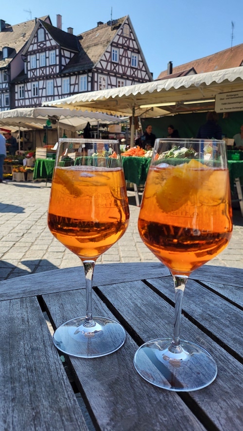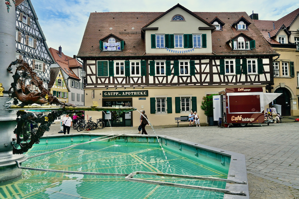 Besonders lohnt es sich an Markttagen hier her zu kommen. Dann ist der Platz richtig belebt. An den Marktständen findest du regionale Spezialitäten, Wurst, Käse, Brot, Obst, Gemüse, frische Schnittblumen etc. von Bauern der Region. Bei schwäbischen Spezialitäten kannst du in der Regel auf die Qualität vertrauen. Nach dem Marktbesuch setze ich mich gern ins Café, trinke einen Kaffee, esse einen Kuchen oder genieße den ersten Aperitivo des Tages – getreu meinem schwäbischen Dolce Vita Lifestyle.