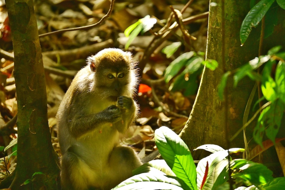 Wir wandern weiter, passieren die Pforte des Gunung Leuser Nationalparks und entdecken kurz darauf eine wilde Schaar Makaken-Affen, die unsere Aufmerksamkeit auf sich zieht. Kleine frechen Makakenkinderaugen schauen uns neugierig an und dann plötzlich raschelt wieder was mächtiges hoch oben im Baum. Da sitzt er. Der gemütliche ältere Herr, der uns von sicherer Distanz weit oben in den Baumwipfeln beobachtet. Als würde er jede Geste verfolgen. Man fragt sich in diesem Augenblick, wer hier wen begafft: wir den Affen oder der Affe uns. Langsam hangelt er sich näher an uns heran mit seinen langen dünnen Armen. Erhofft er sich wie die Makaken Wegezoll in Form von Früchten von uns?